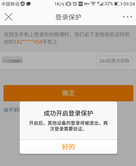 收到验证码之后点击输入,然后会提示我们成功开启了登录保护。在其他设备上登录微博账号会被强制弹出,并且再一次登录的时候是需要验证的。