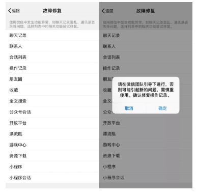 然后会出现故障修复页面,我们根据自己的需求进行修复,这里要注意,一定要在微信团队的引导下进行,不然会引起新的问题哦。