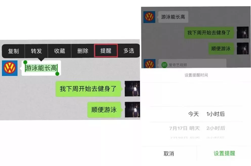 其实微信可以设置定时提醒,让你不再错过重要的事宜。我们长按需要提醒的文字,选择提醒,就会弹出设置时间的界面,进行设置就可以了(这里只能整点的进行选择)。