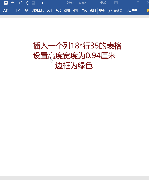1、打开Word文档,插入18*35行表格,设置高和宽为0.94厘米,边框为绿色。