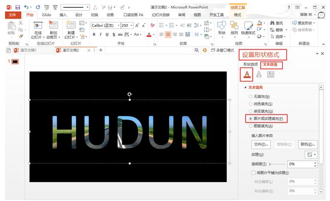 设置背景色——输入文字——设置形状格式——填充——图片或纹理填充——插入图片。