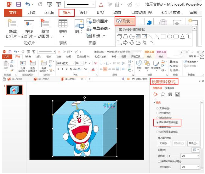 点击插入——形状——设置图片格式——填充——图片或纹理填充——插入图片。