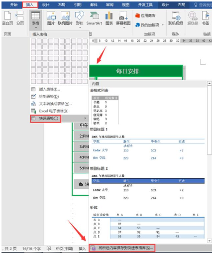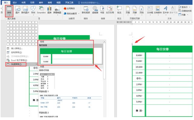 当我们要在文档中快速插入表格时,点击插入——表格——快速表格——选取插入即可。