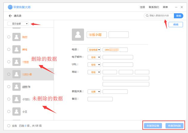 第三步:进入通讯录主界面,橙色的字体表示已删除的通讯录联系人,黑色的字体代表示未删除的通讯录联系人。如果数据太多,可以通过右上角的【搜索框】搜索关键词查找我们想要导出的联系人,点击选择【恢复到电脑】就可以备份数据到电脑上了。