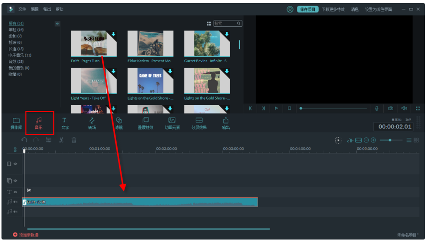 1、点击媒体库的音频显示的“+”,或者直接拖拽文件,添加素材至界面下方的音频轴。如果没有本地音乐,你可以选择万兴神剪手内置音乐素材,点击“音乐”去挑选你喜欢的音乐。