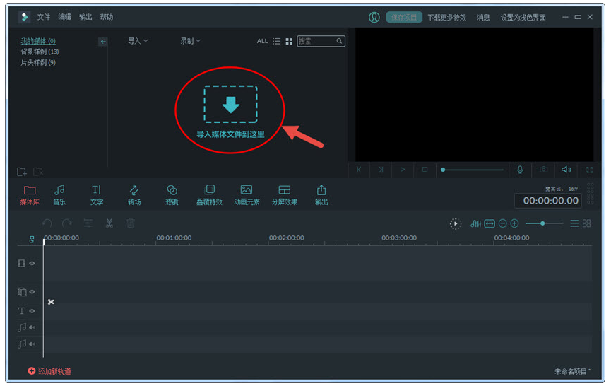 1、打开万兴神剪手软件,点击界面上的“导入媒体文件到这里”,可以导入本地音乐。