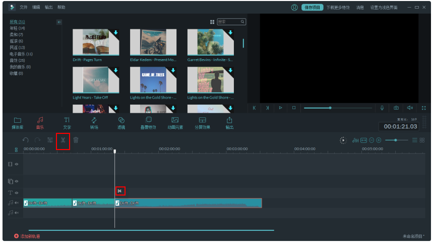 4、点击界面下方时间轴上的小剪刀图标,切分素材。在音乐轴上,每一段切分开的素材前面都显示了一个音符的小图标。