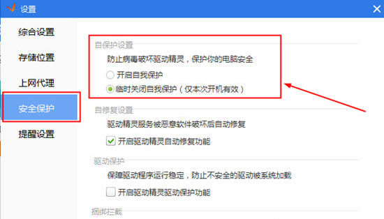 10、在右上角的设置选项里,还能开启自我保护,防止病毒破坏驱动精灵,保护电脑安全,如下图: