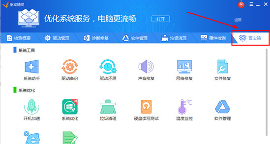9、点击“百宝箱”选项,将会出现系统工具、系统优化和其他推荐三大项,实现一键温度监控,专治系统各种疑难杂症,不愧是我们电脑的“老中医”,如下图所示: