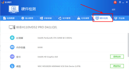 8、点击“硬件检测”选项,呈现给用户的是用户自己主机的硬件配置详情,拒绝奸商,防止被骗!如下图:
