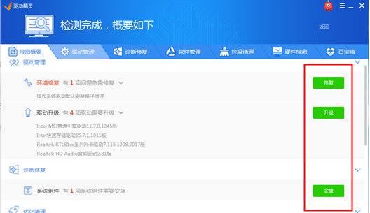 3、检测完成后,跳转到“”检测概要“选项,”将会出现自动检测需要升级的驱动、诊断修复缺少的系统组件、系统需要进行优化、垃圾清理和软件推荐,可以根据自己的需求进行点击修复或升级,如下图: