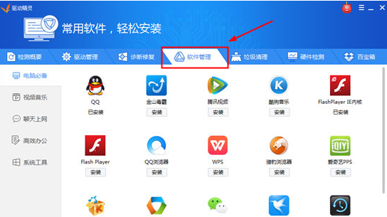 4、不知道电脑缺少什么驱动,可以直接点击“驱动管理”选项进行检测,根据自己的实际情况全选安装或部分升级,如下图: