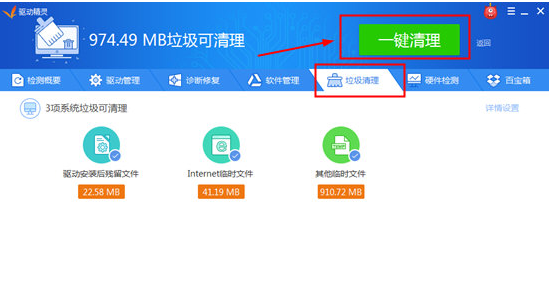 7、点击“垃圾清理”选项,驱动安装后残留文件、各种临时文件,一键清理,方便快捷,如下图:
