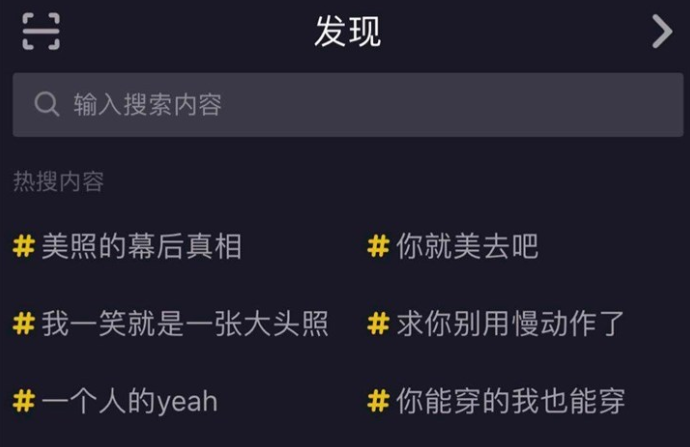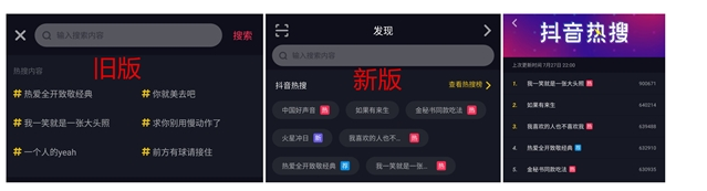 目前打开抖音App左上角的搜索,会出现六条热搜内容,即将上线的榜单功能会进一步把热搜关键词依据热度排行,形式上接近新浪微博的热搜功能。