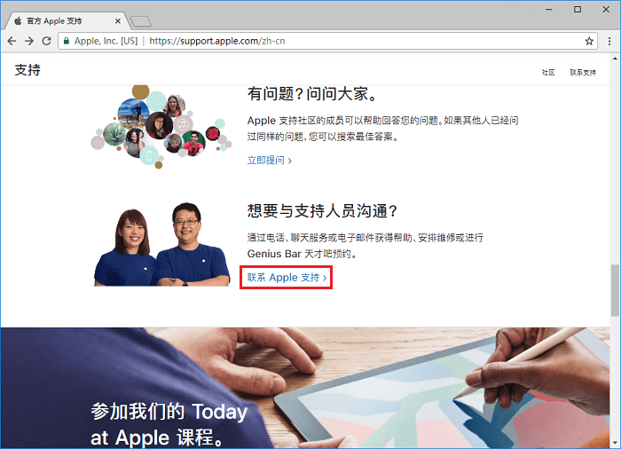 1.进入苹果中国官方主页的「技术支持」界面,向下滑动,找到「联系 Apple 支持」;