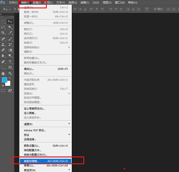 在电脑上打开PS软件,点击编辑——键盘快捷键,如下图所示: