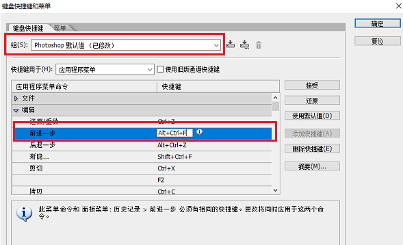 点击快捷键,可以进行设置,同时按住想要设置的快捷键,点击确定就设置成功了,上面的分组也会变成photoshop默认值(已修改),如下图所示: