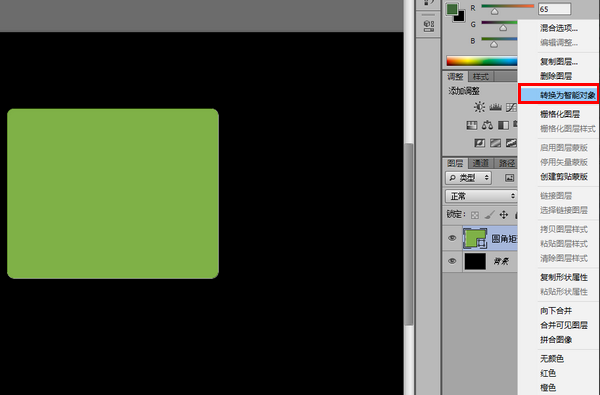 然后在圆角矩形所在的图层上右击鼠标,选择“转换为智能对象”。