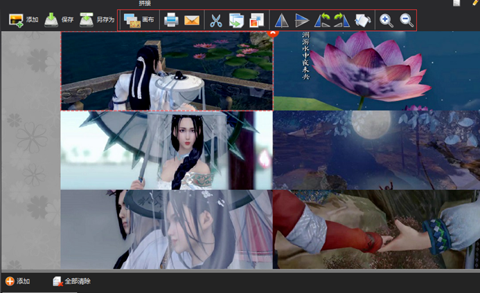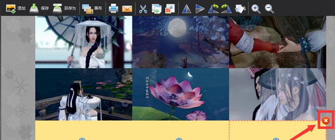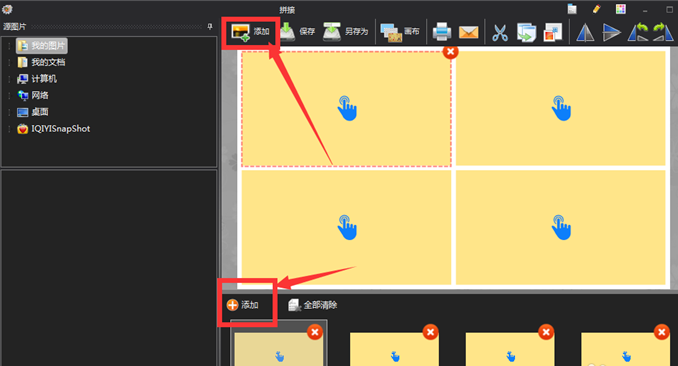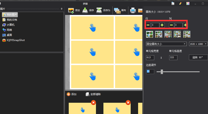 在画布大小里面调整行数和列数,单元格宽高、边距,点击工具栏右侧的“添加”,添加需要拼接的图片,