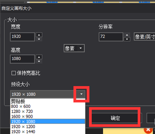 点击工具栏上的“画布”,在弹出的菜单里点击“自定义画布大小”,点击“预设大小”的下拉菜单选择画布大小,也可以直接输入数值,然后点击确定,