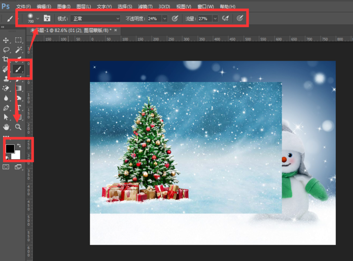 选择画笔工具,前景色设置为黑色,调整画笔的属性,选择一个柔画笔,适当降低不透明度和流量,如图所示。