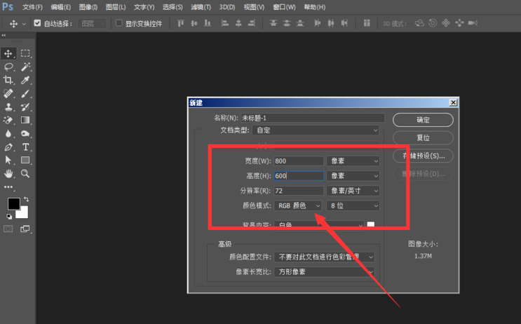 打开PS软件,新建一个画布,根据自己的需要来设置大小,
