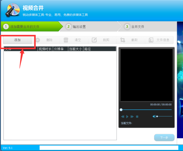 进入视频合并页面,选择添加按钮,将需要合并的视频文件添加进来,
