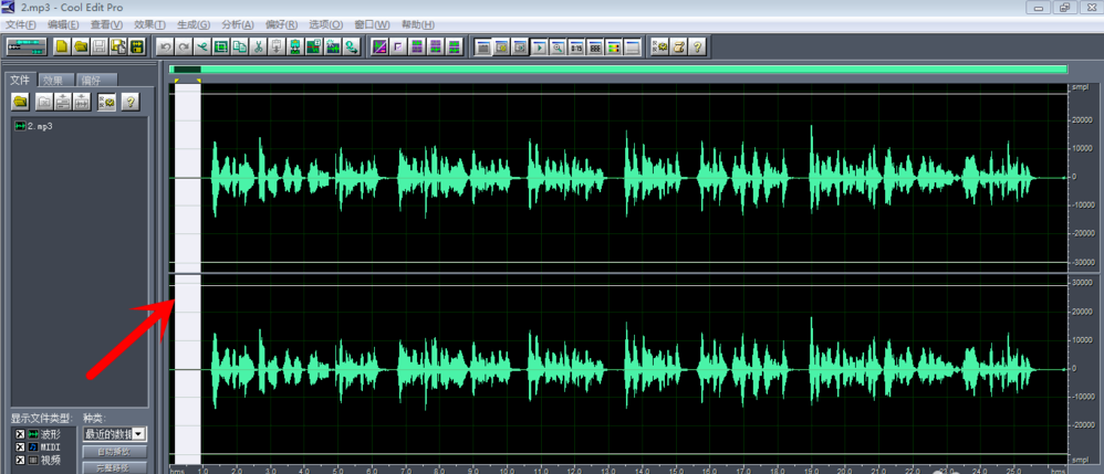 打开Cool Edit软件,点击箭头指示的文件夹图标导入音频文件,如图,小编使用的是汉化版软件,
