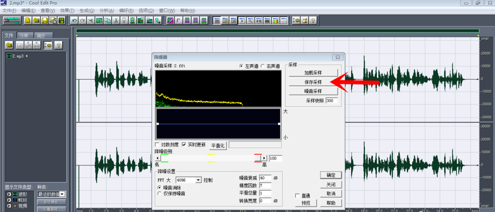 在弹出的对话框中点击【噪音采样】,然后点击【保存采样】,将噪音采样文件保存到桌面上,