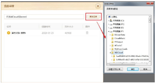 录课文件格式为:.ndpr,默认文件保存路径为:E:\\NdCloud\\Record。教师也可点击“更改目录”按钮修改保存路径。