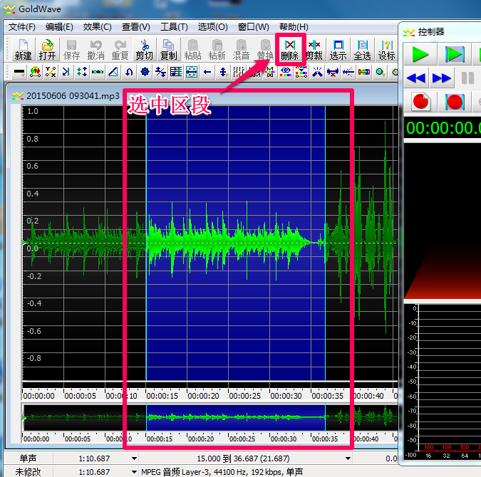 2、选取区段有两个方法,一是通过GoldWave软件的“设标”功能来准确定位音乐的时间轴(示例为选取原音乐15秒开始到36.68735秒结束),也可以通过拉动,如图。