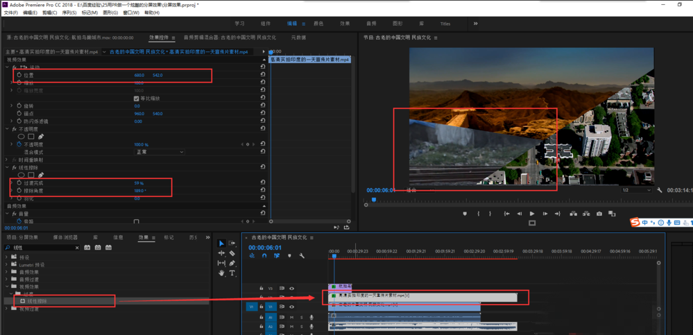 同理,选中轨道2视频,将线性擦除效果也施加给轨道2视频,在效果控件中调整线性擦除效果的过渡完成与擦除角度的数值。