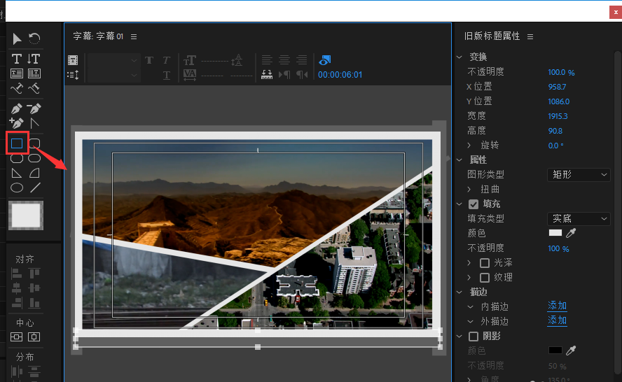 在字幕编辑窗口中找到工具栏中的矩形工具,绘制两条宽度合适的矩形,然后将其旋转,移动到分屏视频的分割线处;用矩形工具在视频边框四周画出矩形长条,使其更好看,编辑好之后可以退出字幕窗口。