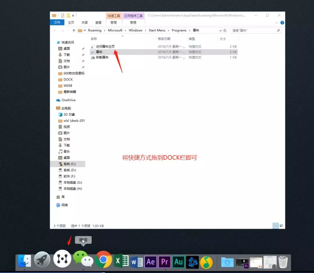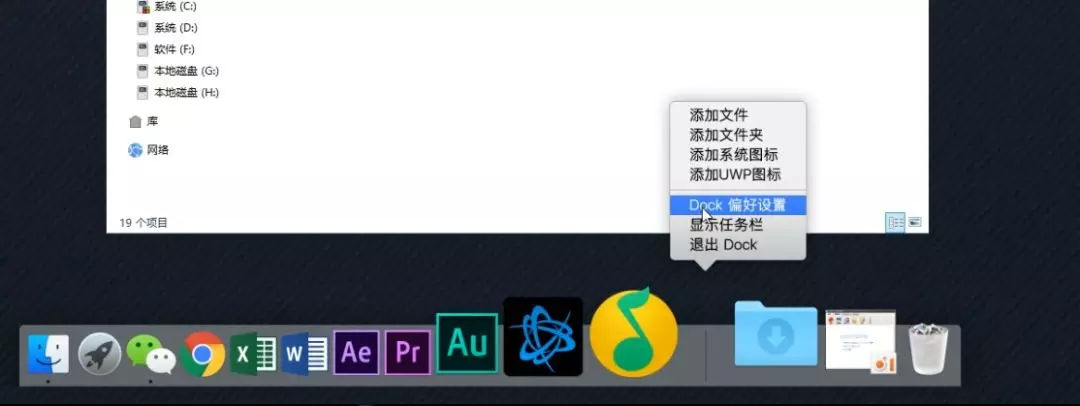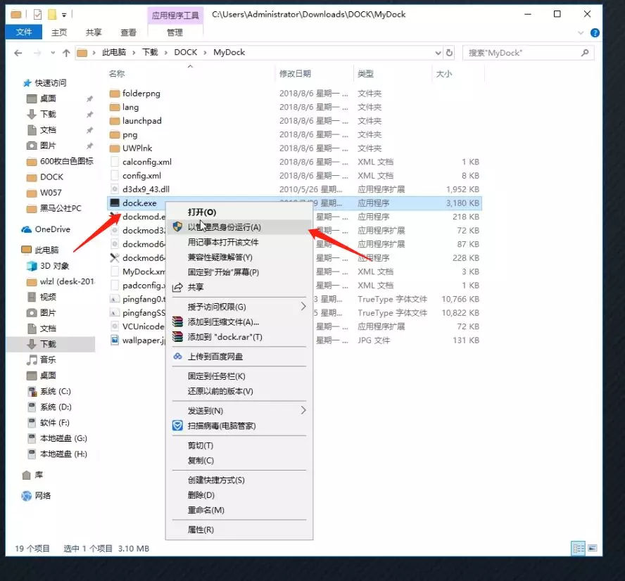 下载安装仿MACDOCK,将软件解压后,选中 dock.exe,右键以管理员身份运行,这样屏幕下方就会弹出Dock 栏了。