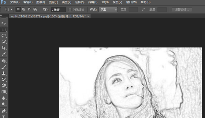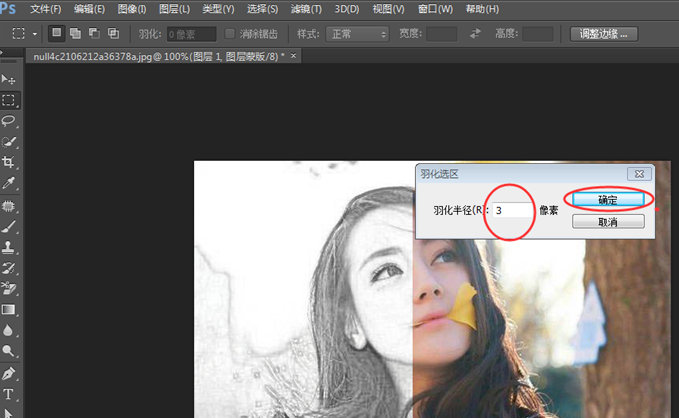 这时半素描的效果已经出来了,但中间那条线过于生硬,我们可以用羽化效果让它更柔和,用矩形选框工具框住中间那条线,然后点击鼠标右键,在弹出的选项中点击【羽化】,羽化半径大概5像素,点击【确定】后,按Delete健清除到自己满意的效果为止;