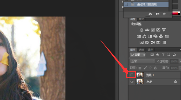 打开PS软件,导入图片素材,按Ctrl+J复制图层,得到图层1,点击图层1前面的小眼睛,将小眼睛关掉;