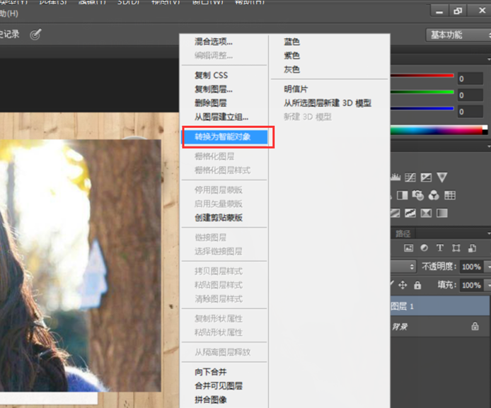 在图层面板中用鼠标右键点击图层1,在弹出的选项中点击【转换为智能对象】,按Ctrl+T键自由变换图像、移动到自己觉得合适的位置;
