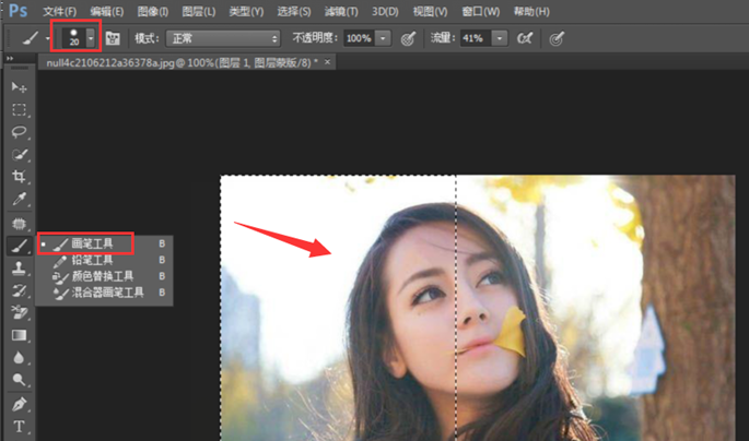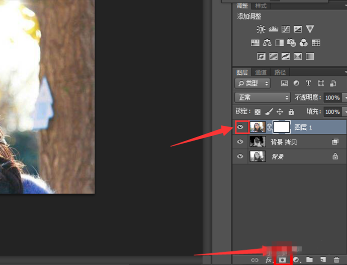 在图层面板里点击图层1前面的小眼睛,打开图层1,添加图层面板,在工具栏里用矩形选框工具,把人物图像左侧框起来,得到下图效果;