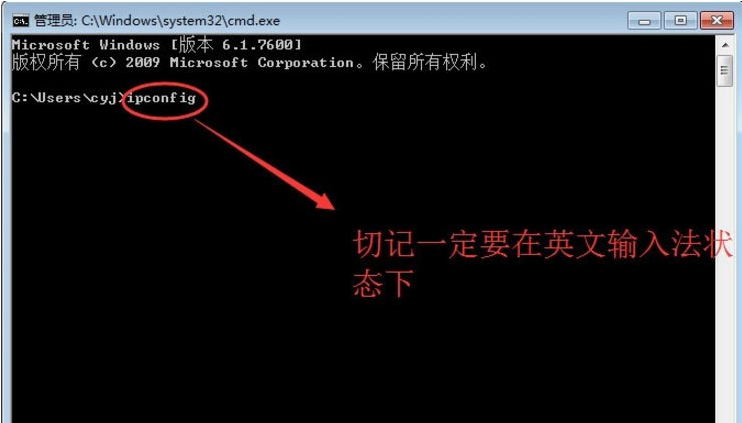 2、在Dos窗口中光标跳动的地方输入“ipconfig”,然后回车;