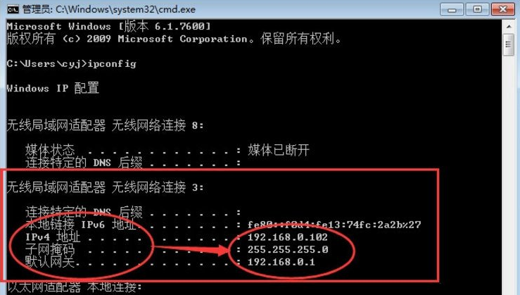 3、最后就可以看见我们这台计算机的IP地址,子网掩码以及默认网关。