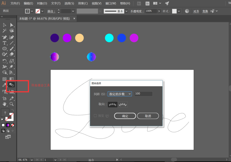 准备工作已经做好,现在选中两个渐变色双击【混合工具】,弹出弹框选择”指定步数”,我现在填得是500步,步数越大,圆和圆的间距越小,点击确定,