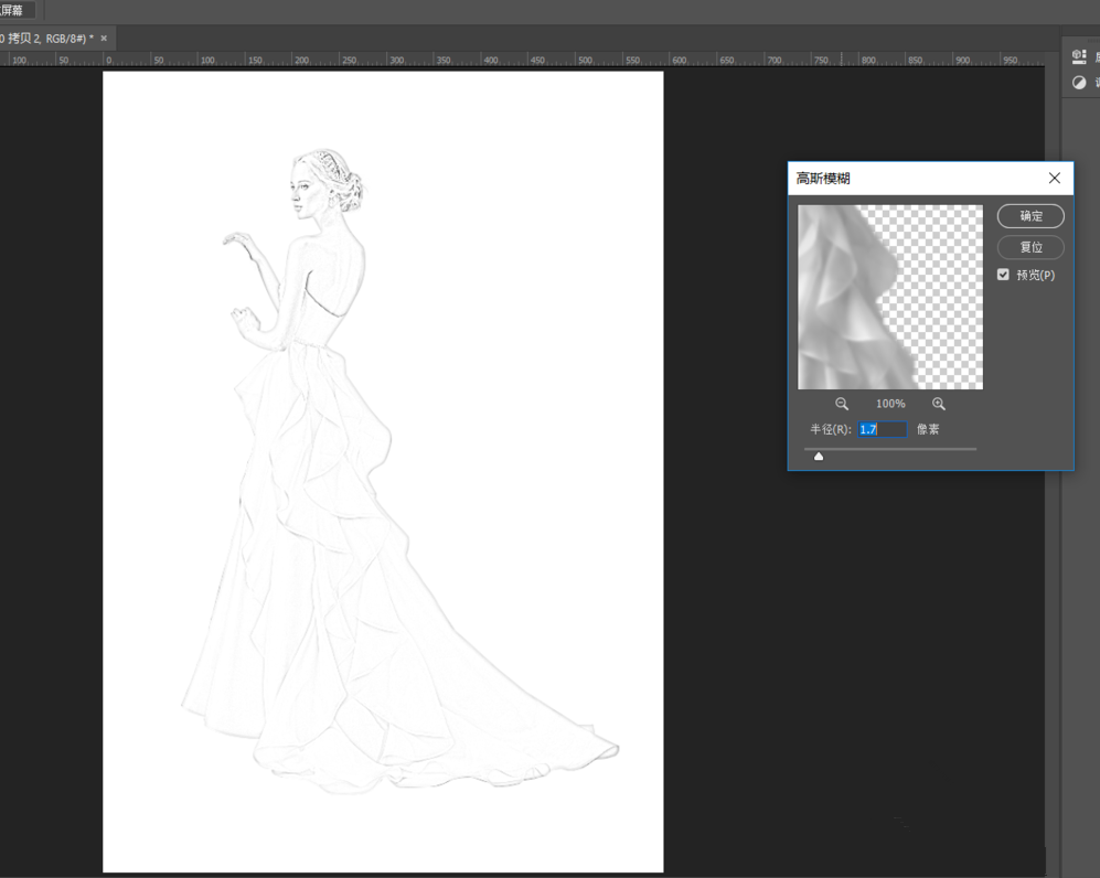 然后在滤镜里找到模糊,选择高斯模糊,一般半径调到2左右就可以了,这个时候线稿就出来了。