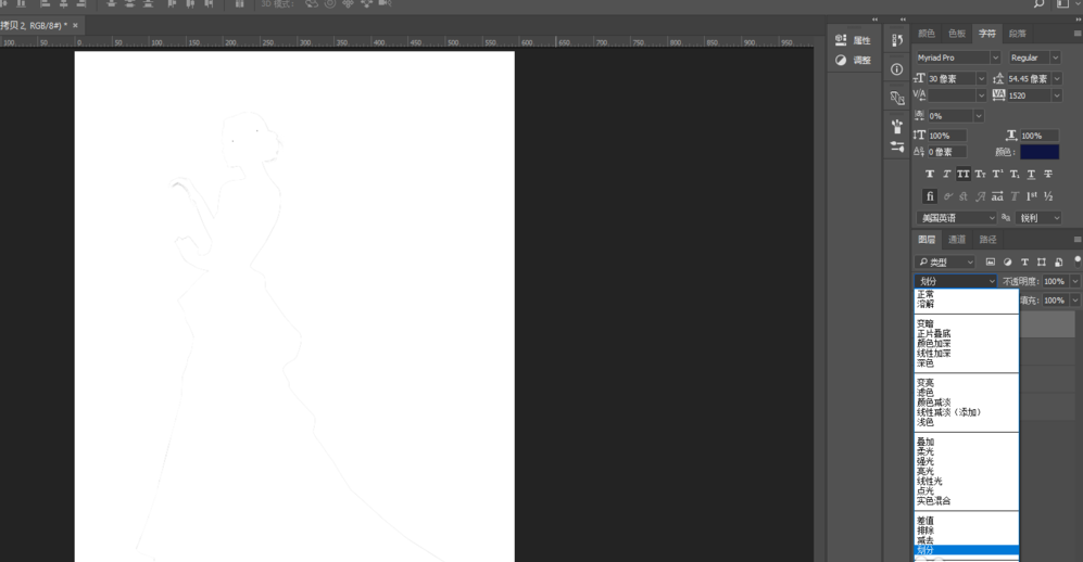 把最上方一个图层的混合模式改为划分,这个时候画布变白低了,但还是可以隐约看到一层虚线轮廓。