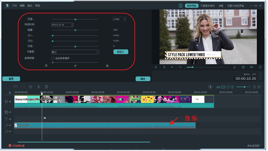 3、点击“音乐”,导入准备好的BGM,并拖拽到音乐轨道。双击编辑。调节音量大小,淡入淡出程度,最关键的是要进行变声操作,左右滑动杠杆调节变声幅度。