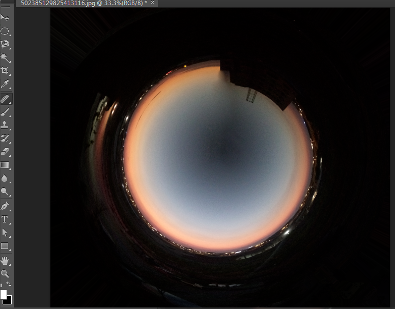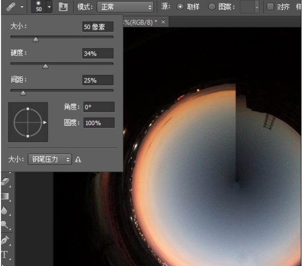 然后选择修复画笔工具来处理极坐标的边,调整合适的笔刷和硬度(硬度小一点,看起来更柔和)。