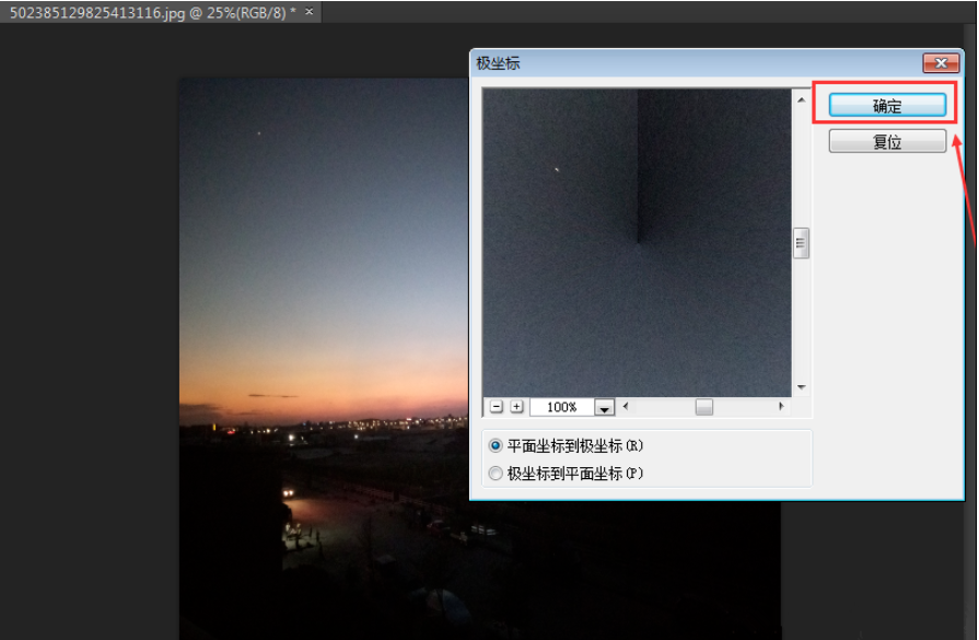 点击菜单栏上面的滤镜-扭曲-极坐标,然后点击确定。