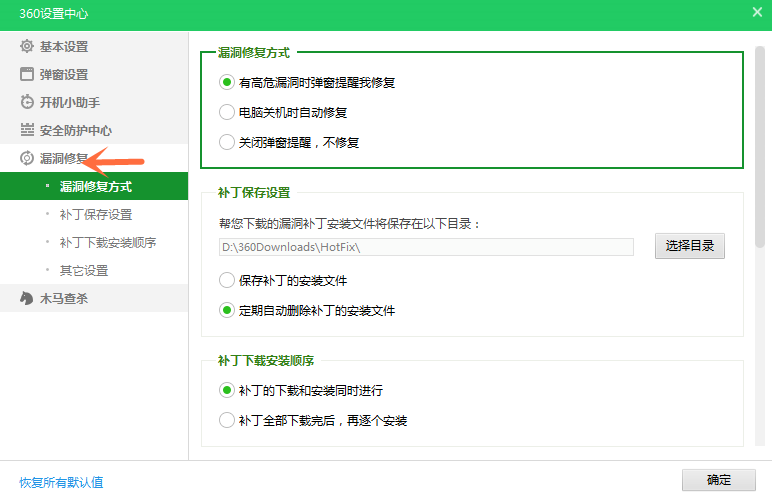 然后会弹出“360设置中心”窗口,点击左侧的“漏洞修复”菜单,如图,