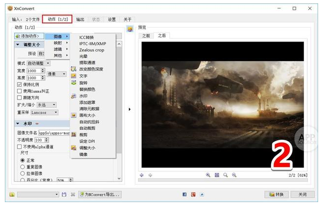 “动作”也是XnConvert的一大亮点,每一项修改作为一项动作,添加动作后可以拖动排序,程序化的复杂处理也能一次完成,灵活简便。
