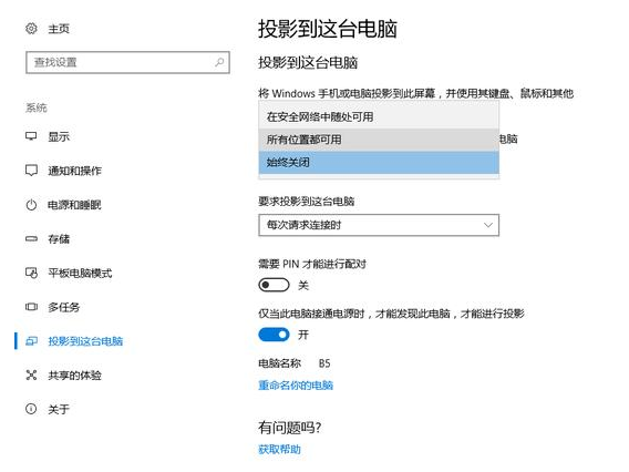 点击【系统】-【投影到这台电脑】-【所有位置都可用】。