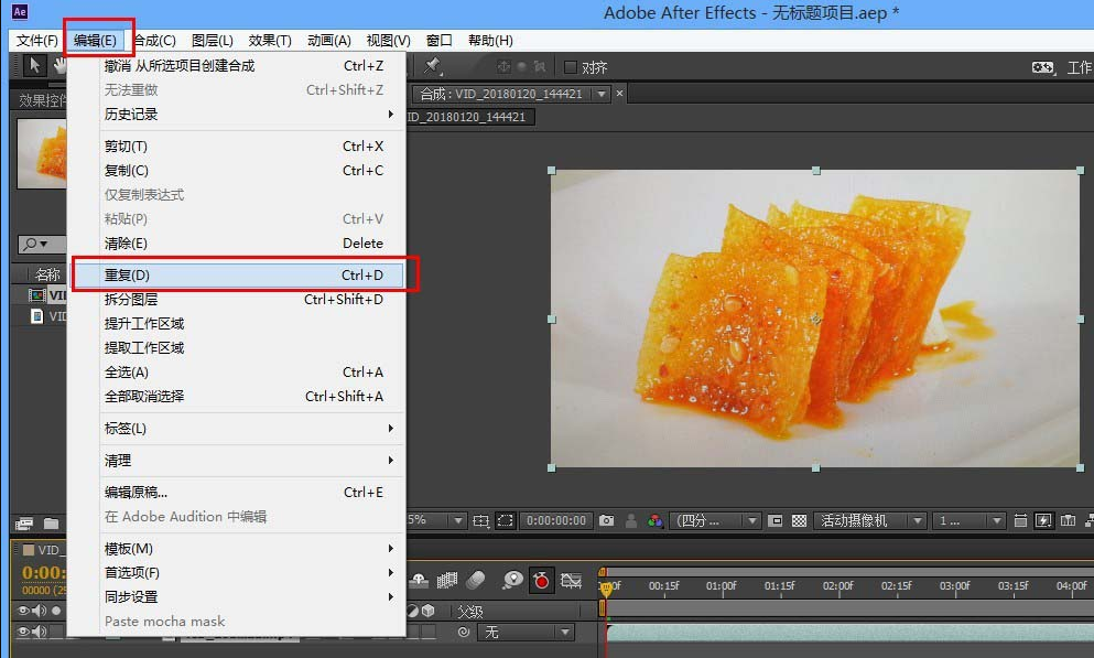 2、点击编辑重复,或者直接用快捷键ctrl+d复制一层,可以看到有了两个图层,